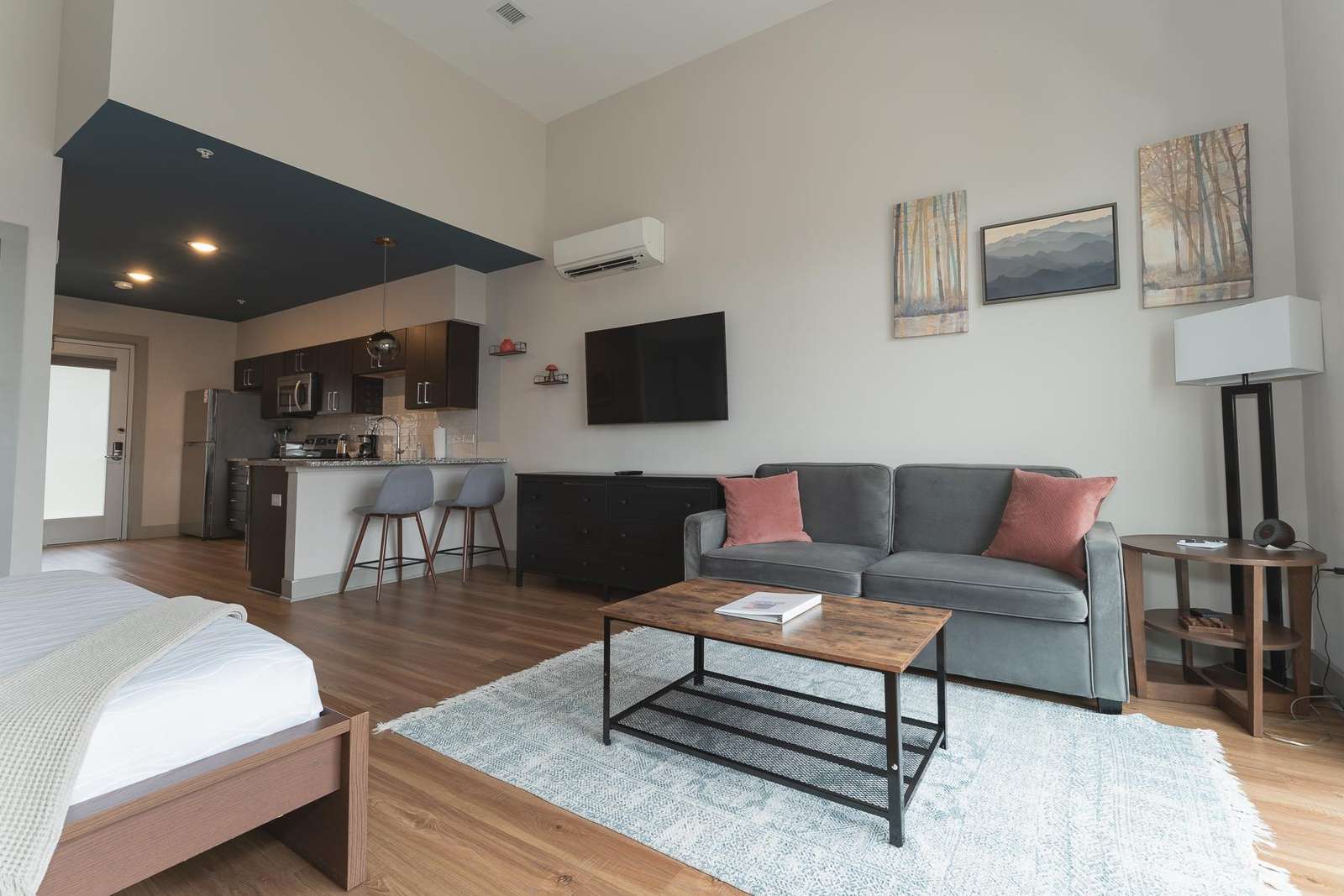 Modern and spacious for a studio with a huge ceiling. Great location. This unit is under some noisy HVAC equipment for the building, and could disrupt sleep.