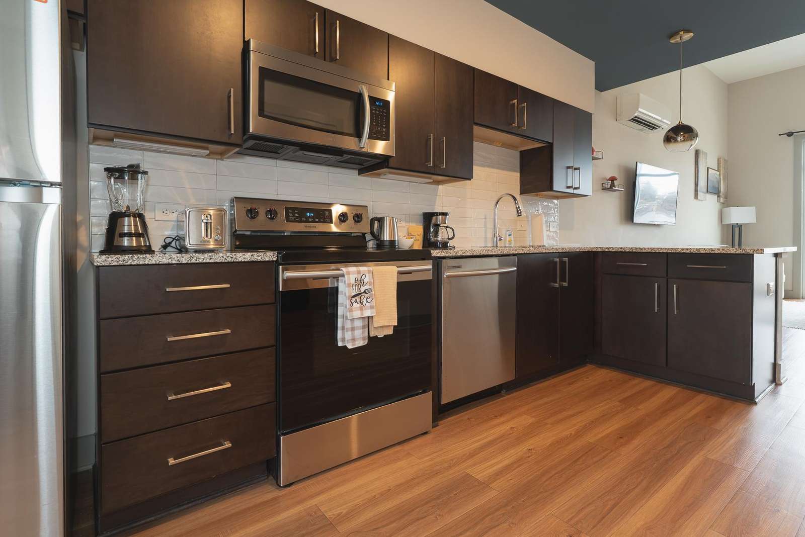 The full kitchen includes an oven, refrigerator, dishwasher, microwave, toaster, coffee maker, tea kettle, cookware, dishes, and utensils, plus dish soap and dishwasher detergent. Fresh linens and towels are provided, along with a shower dispenser stocked with Paya shampoo, conditioner, and body soap. Enjoy extras like under-sink water filtration and a starter bag of locally roasted PennyCup coffee.