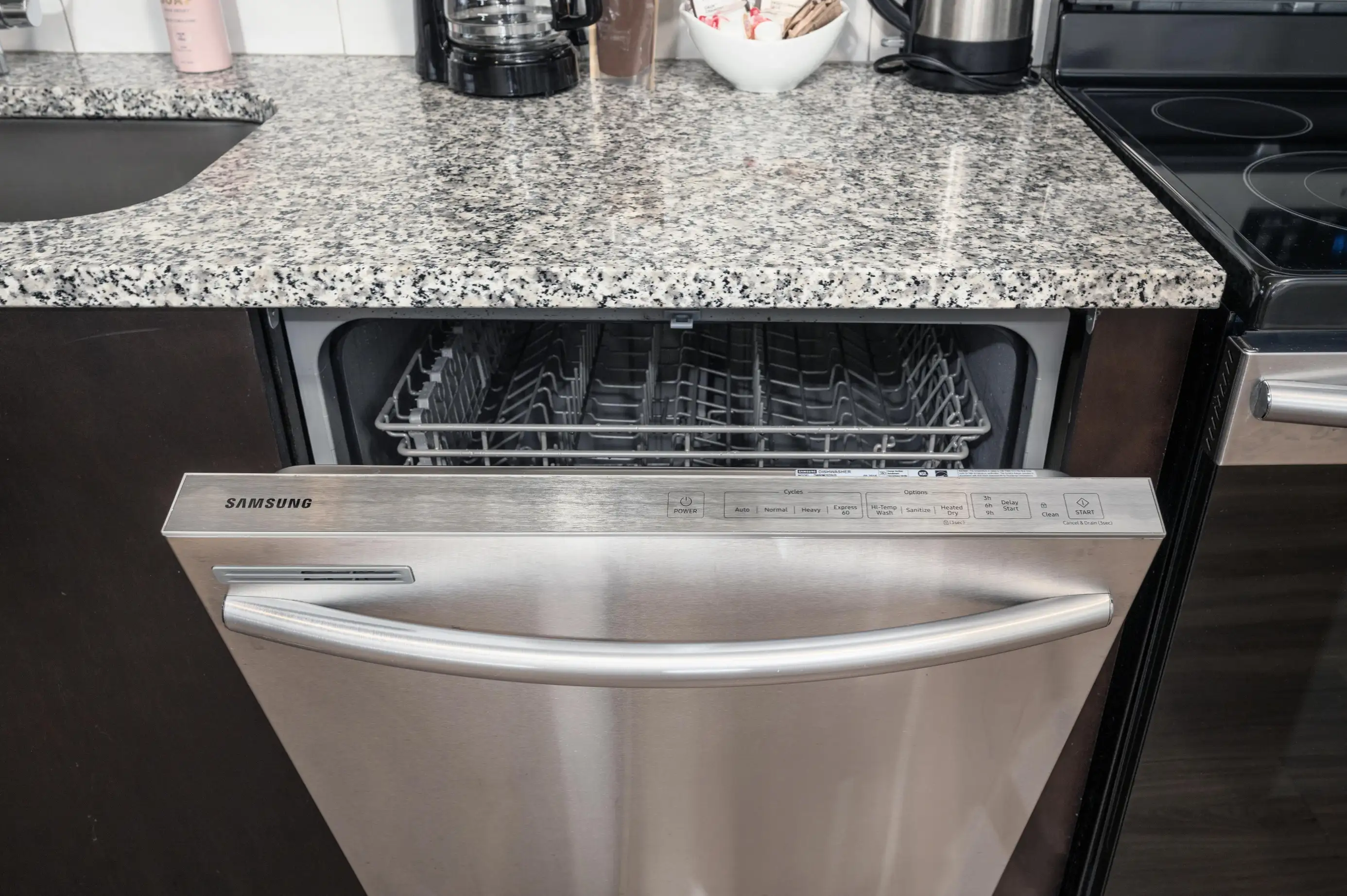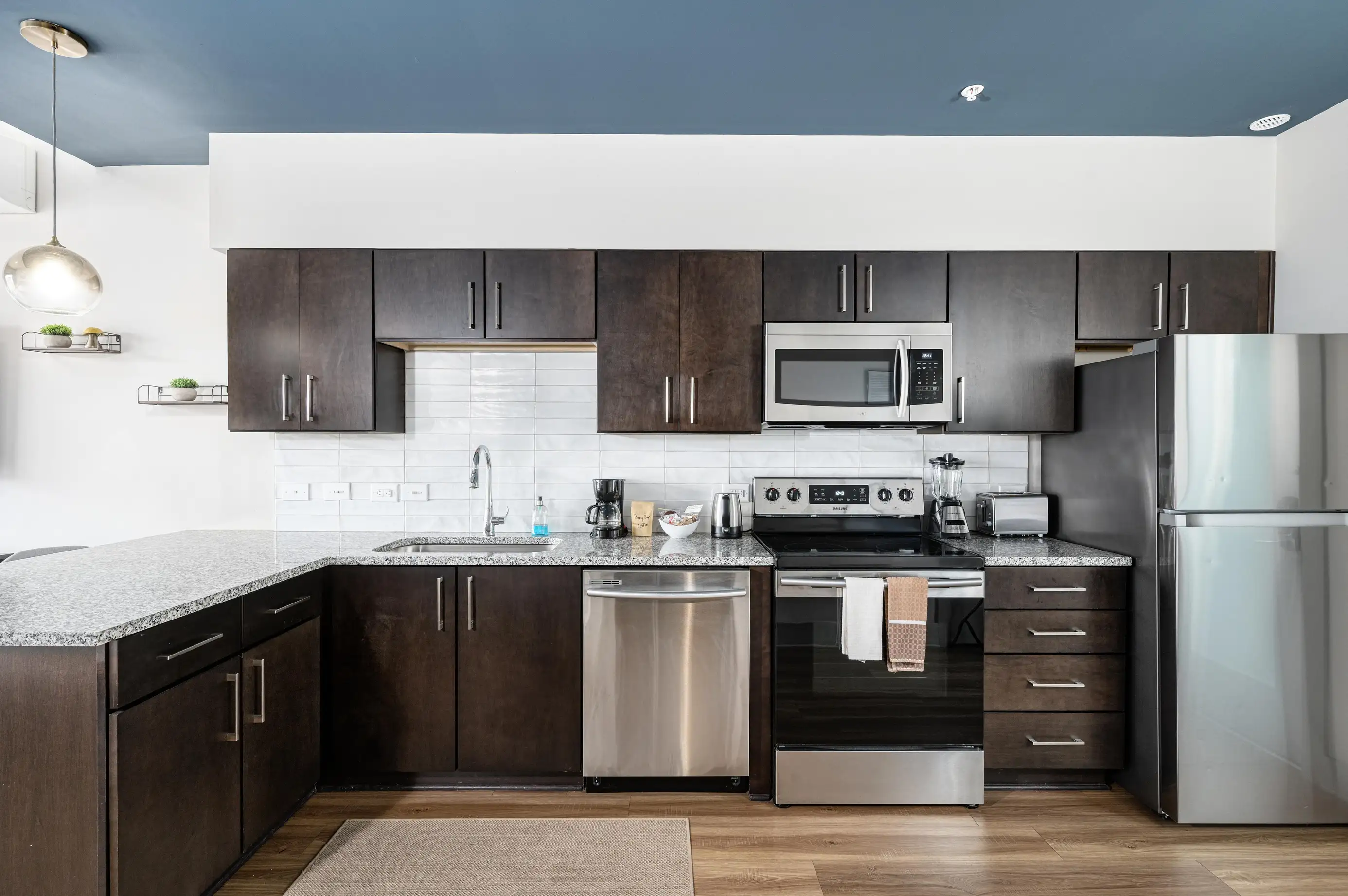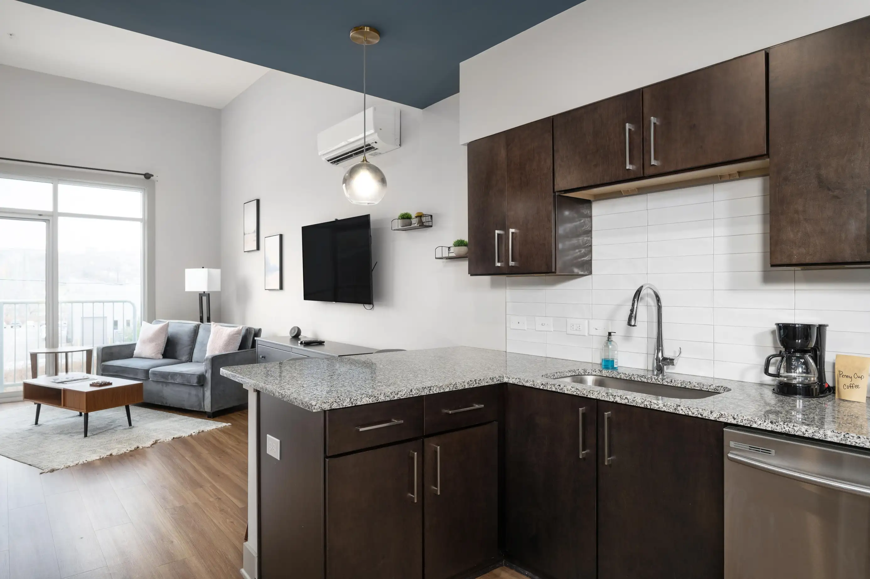 The full kitchen is perfect for dining in and includes a full-sized oven and range, refrigerator, dishwasher, microwave, toaster, coffee maker, electric tea kettle, and a complete set of cookware, dishes, utensils, plus dish soap and dishwasher detergent. Fresh linens and towels are provided, along with a shower dispenser stocked with Paya shampoo, conditioner, and body soap. You’ll also enjoy thoughtful extras like under-sink water filtration and a starter bag of locally roasted PennyCup coffee.